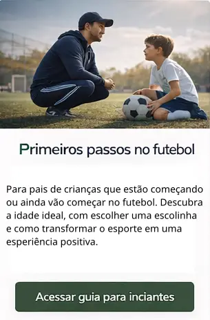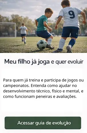 Encontre escolinhas confiáveis, entenda os caminhos do futebol de base e tome decisões seguras para o futuro de seu filho.